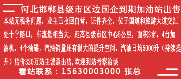800万安徽2025-04-01ZH2090925河北张家口乡镇加油站出租出售,现有面积15亩,个人土地,证件齐全,加油机6台12枪,位于国道,营业额一天5-6万,柴油多,五公里内没站,出租价50万,三年一交,出售价500万,联系电