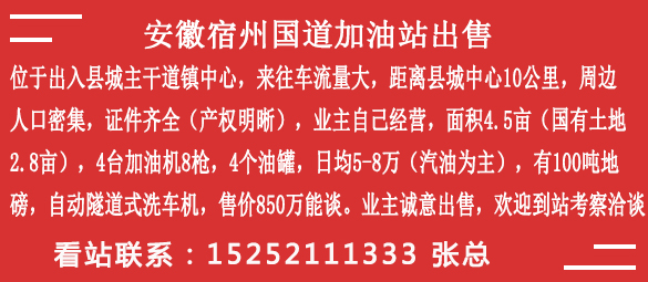 800万安徽2025-04-01ZH2090925河北张家口乡镇加油站出租出售,现有面积15亩,个人土地,证件齐全,加油机6台12枪,位于国道,营业额一天5-6万,柴油多,五公里内没站,出租价50万,三年一交,出售价500万,联系电